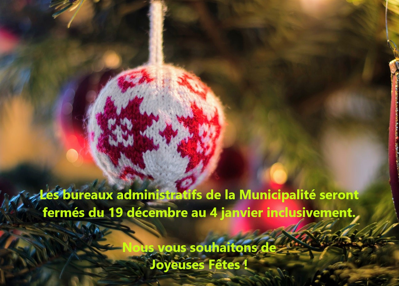 LES BUREAUX ADMINISTRATIFS DE LA MUNICIPALITÉ FERMÉS DU 19 DÉCEMBRE AU 4 JANVIER INCLUSIVEMENT